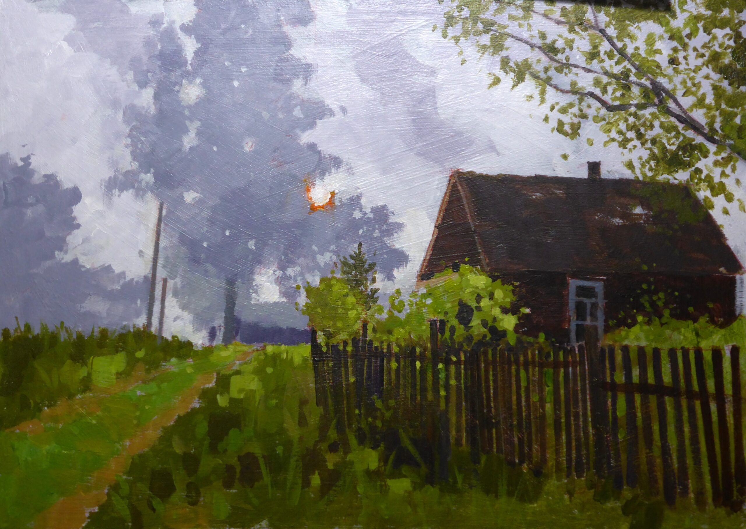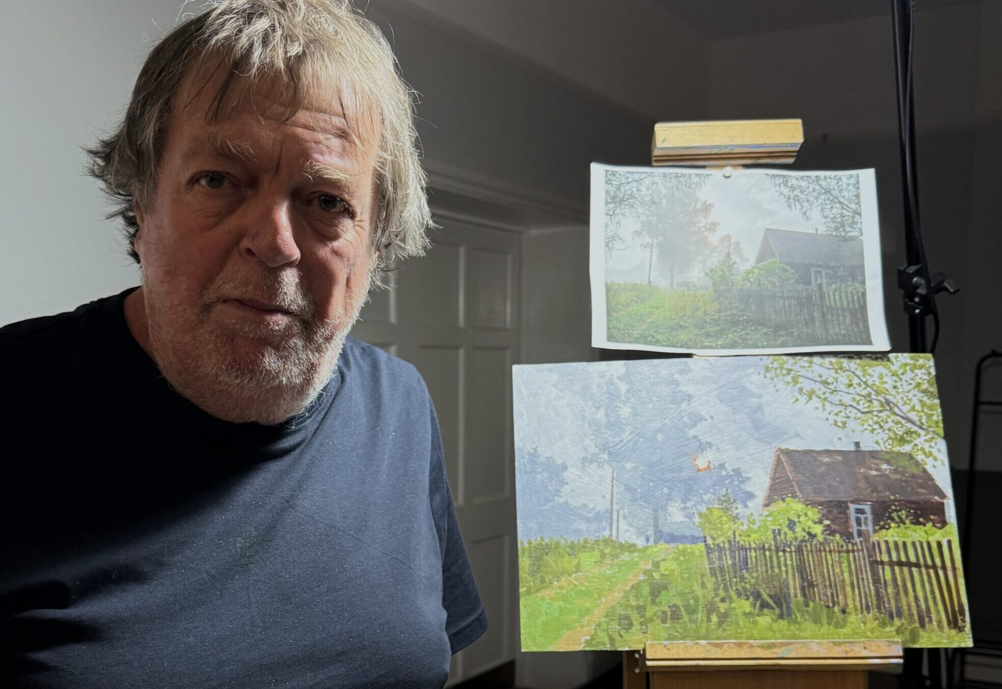 At our Monthly Meeting in October Kevin Sculley, another new demonstrator to us, came to do an acrylic demo of ‘buildings in the landscape’. He brought a photo of a rather misty scene of a small house and showed us how it could be developed into a charming, atmospheric painting.