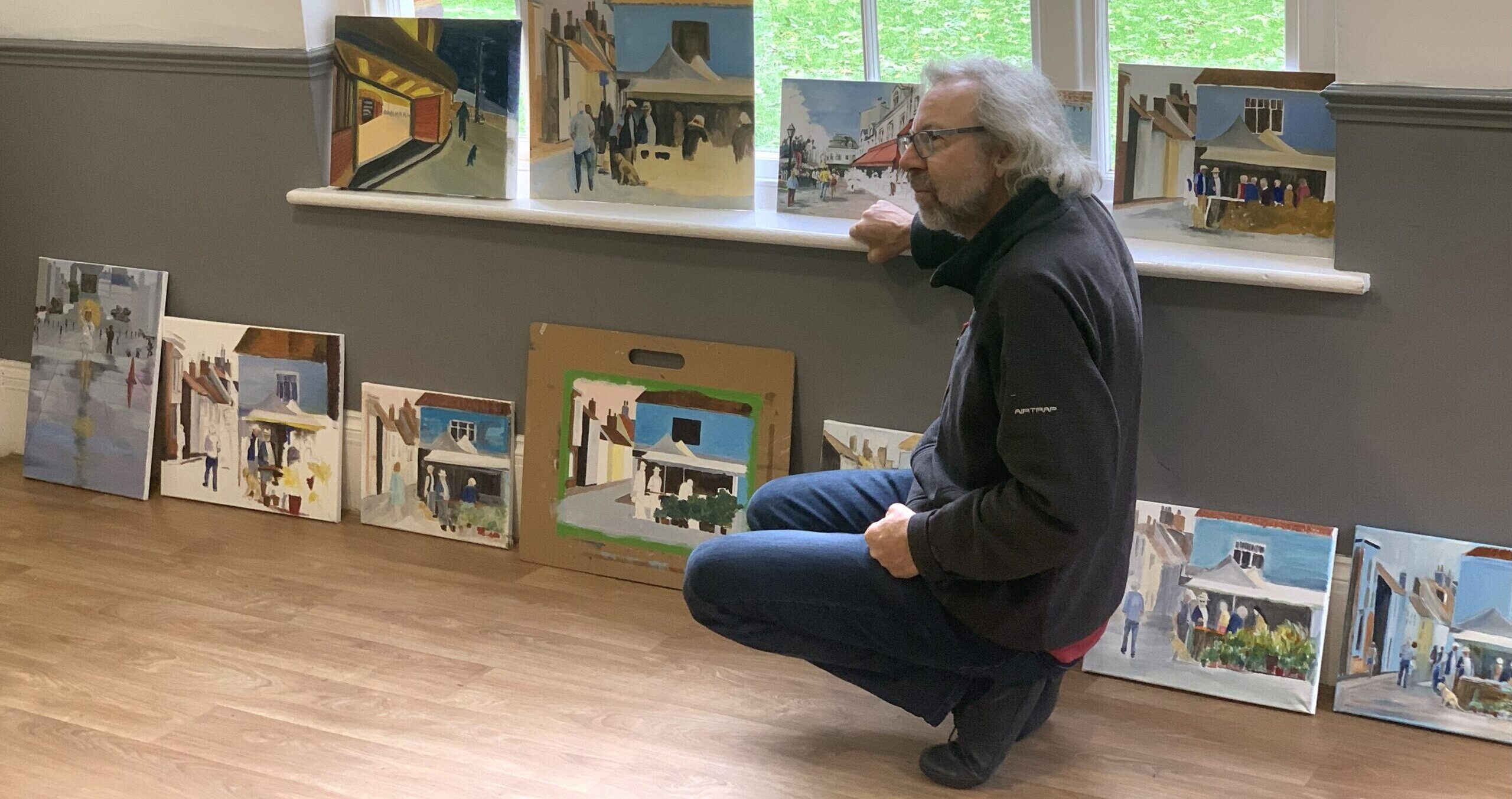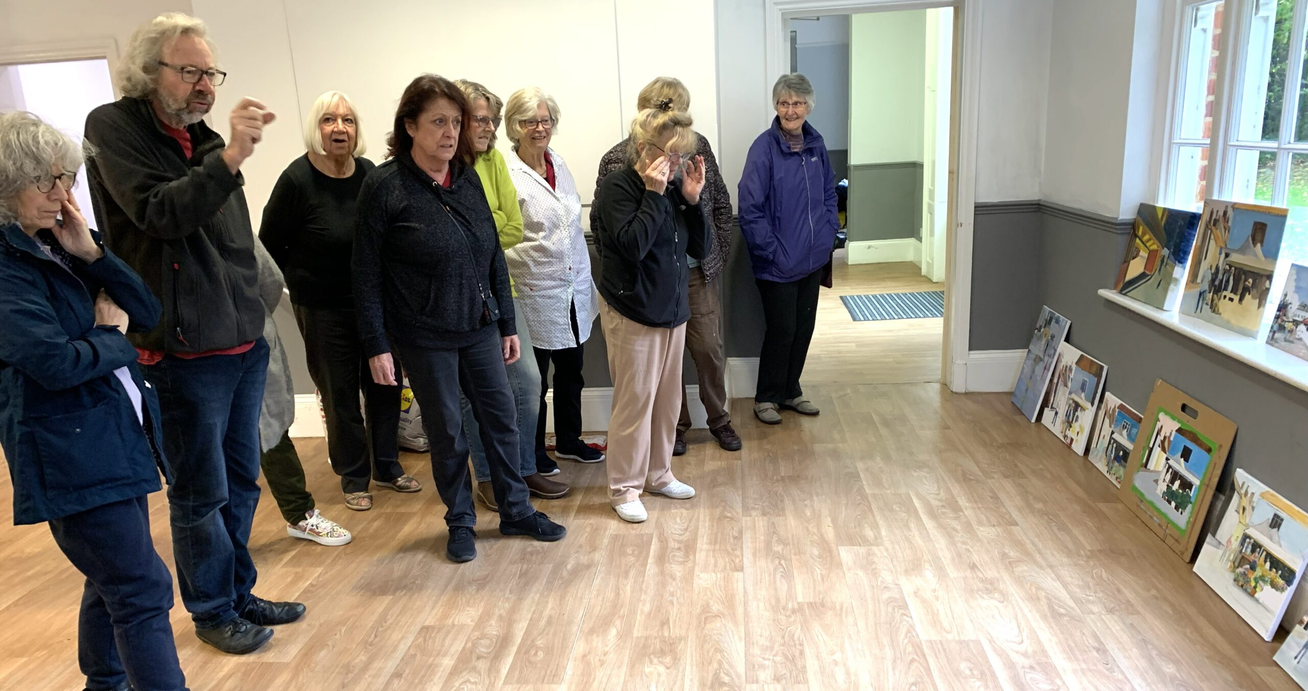 Early in October 16 ‘happy painters’ gathered at the Parish Centre for a workshop with Paul Alcock. The theme was an urban scene with figures, using oils or acrylics. He started with a demonstration based on a Southwold Market scene, and brought prints of the photo for us, if we chose to work on that. He gave lots of advice and throughout the day he was busy chatting with members and helping them with their paintings. Altogether another very enjoyable day’s painting.