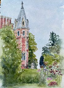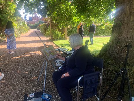 Outdoor Painting at Taplow Court. We had seven painters at our painting day on an unusually hot day for September. Most of us retreated under the shade of a lovely tree which gave views of the fine waterfall or down the path to the main house. Friendly staff on duty for the open day stopped by often to see our work, as did many interested visitors. We all went off at some point to enjoy one of the delicious cream teas available in the nearby café – irresistible.