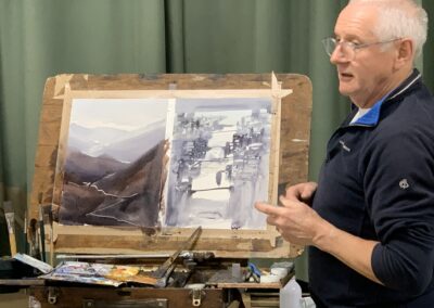 In November we had the pleasure to welcome Brian Smith RI to run a watercolour workshop for us, and indeed a pleasure it turned out to be. Brian was the most informative tutor that we have ever had. He went through the basics of watercolour painting, tonal values, perspective, depth, how to use the brush etc. Brian had multiple samples of his own works and we were encouraged to use/copy them to learn. In the afternoon people either continued with the small sketches or tried a bigger landscape, and the results were fantastic. At a modest estimate we must have produced 75 or 80 paintings between us!